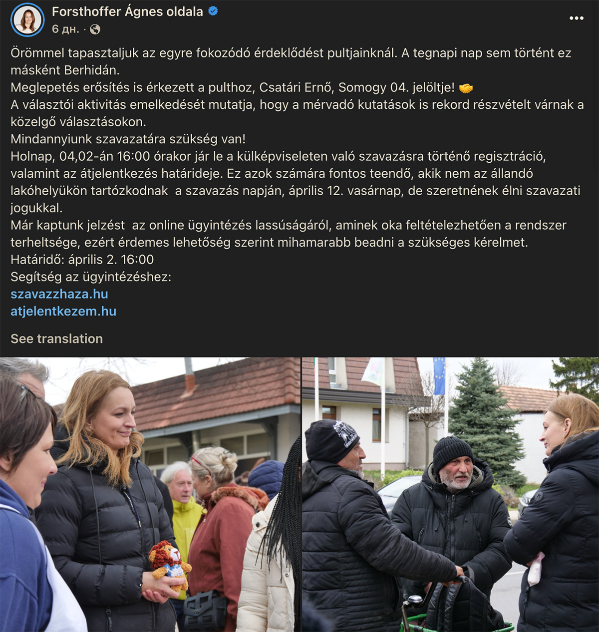 Судячи з дописів на сторінці Аґнеш Форштоффер, її сфера відповідальності в кампанії — охорона здоров’я, соціальна справедливість і дотримання єдиних процедур в управлінні. Вона публікує інформацію про участь у заходах і агітаційних турах на підтримку інших кандидатів від «Тиси» — і, як правило, з’являється на фото на невеликих заходах, де можна спілкуватися без мікрофона.
