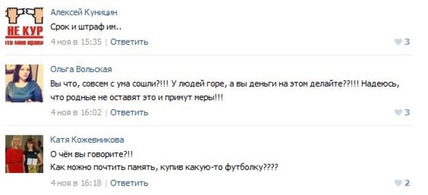 «Будь у тренді, замов футболку і тужи разом з нами», «Модна кофта з Дариною Громовою», «Родичам загиблих знижка», - свідчать підписи під товарами.