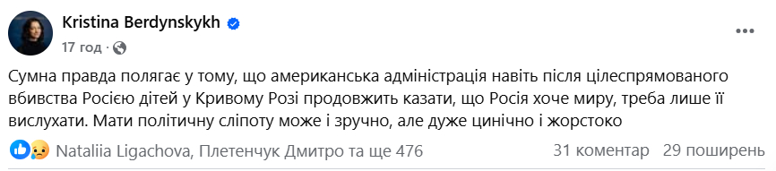 Про реакцію американців написала і журналістка-фрилансерка Христина Бердинських: «Американська адміністрація навіть після цілеспрямованого вбивства Росією дітей у Кривому Розі продовжить казати, що Росія хоче миру».
