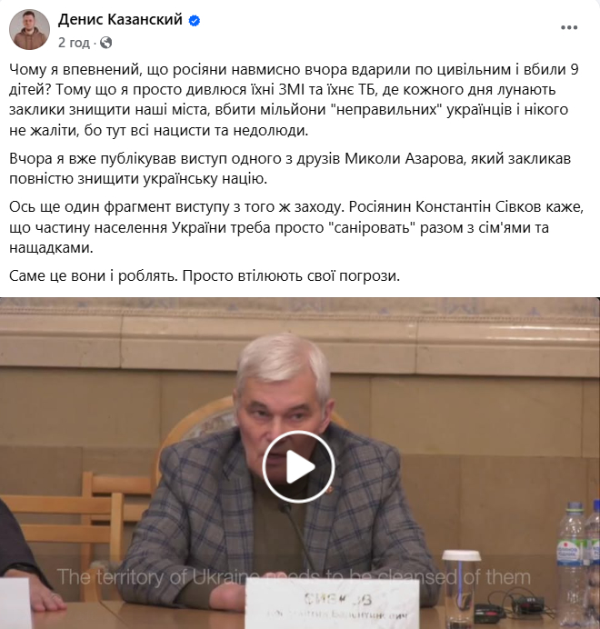 Журналіст та блогер Денис Казанський впевнений, що росіяни навмисно вдарили по цивільним, адже у їхніх медіа кожного дня лунають заклики знищити наші міста, вбити мільйони «неправильних» українців, бо тут всі нацисти та недолюди. Таким чином вони просто втілюють свої погрози.