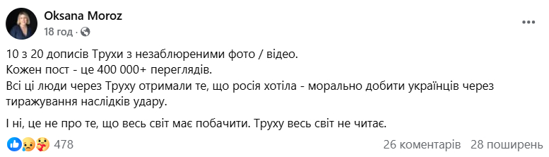 Про шкоду таких публікацій написала і засновниця ініціативи «Як не стати овочем» Оксана Мороз. На її думку, через незаблюрені фото та відео,, які поширюють телеграм-канали, зокрема «Труха», Росія добивається своєї мети — морально добиває українців.