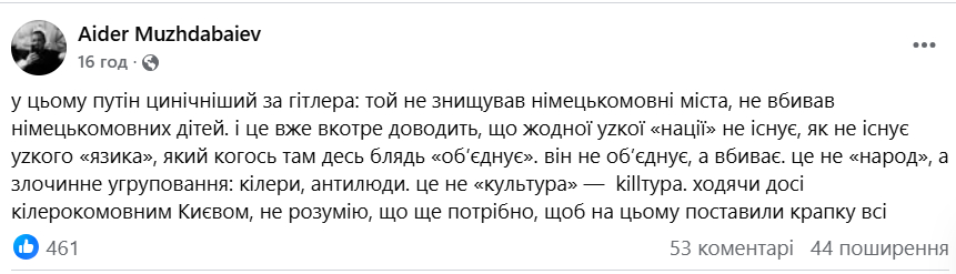 Заступник гендиректора телеканалу ATR Айдер Муждабаєв пише, що в якомусь сенсі Путін навіть цинічніший за Гітлера — принаймні у використанні так званого «мовного питання».