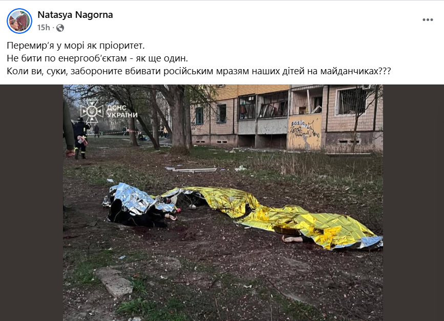 Кореспондентка «1+1» Наталія Нагорна написала, що удари по жилих районах українських міст, від яких гинуть діти, відбуваються на фоні «перемир’я» у Чорному морі.