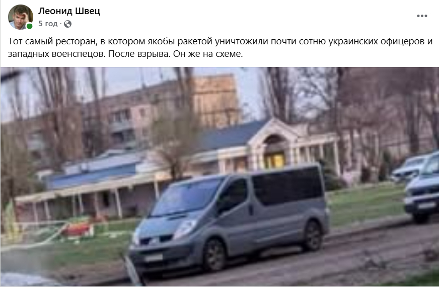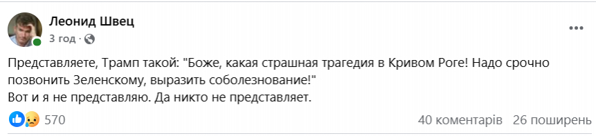 Публіцист Леонід Швець пише, що важко уявити, щоб Дональд Трамп висловив слова співчуття Володимиру Зеленському. А також публікує фото ресторану, в якому, як стверджує російське міністерство оборони та пропаганда, українські військові начебто влаштували нараду, і по якому «високоточно» влучила російська балістична ракета.