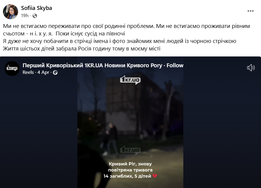 Виконавча директорка онлайн-медіа «Перший Криворізький» Софія Скиба присвятила трагедії кілька емоційних дописів, в одному з них додала відео зі звуками вибухів у центрі Кривого Рогу, її рідного міста.