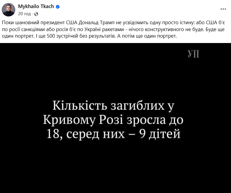Керівник відділу розслідувань «Української правди» Михайло Ткач пише, що адміністрація Трампа досі не усвідомила, що Путін не збирається припиняти війну.