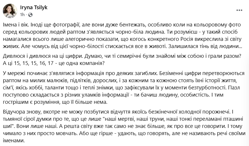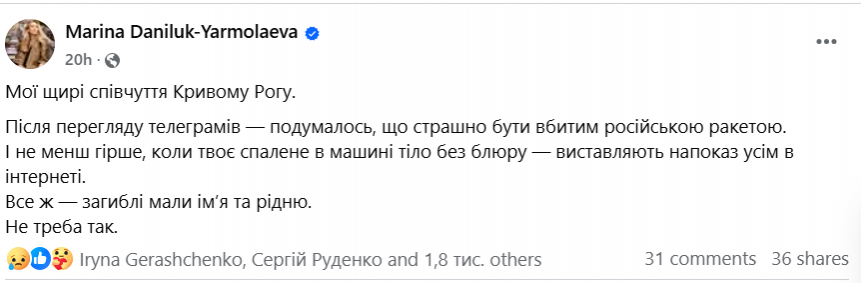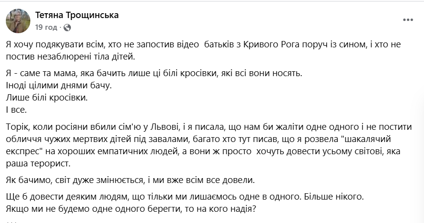 Журналістка та медіаменеджерка Тетяна Трощинська подякувала тим, хто не постить фото та відео загиблих і їхніх родичів в Кривому Розі.