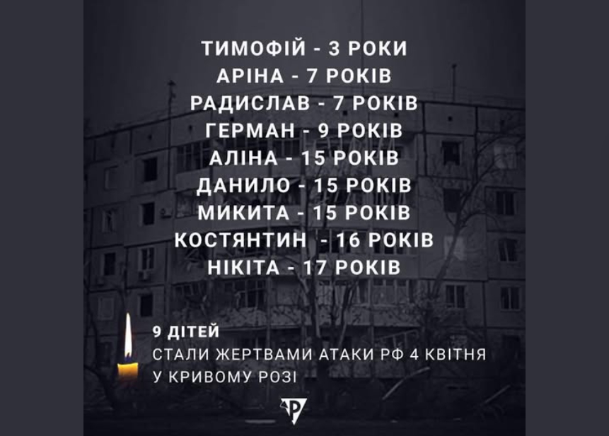 Ввечері 4 квітня під прицілом російських ракет опинився житловий квартал Кривого Рогу, де, як і в будь-якому іншому мирному місті, знаходився дитячий майданчик. Внаслідок обстрілу загинуло 19 людей, серед яких дев’ять дітей. Також станом на 5 квітня відомо про понад 70 поранених, 17 людей у важкому стані. 7-9 квітня оголошені у місті днями жалоби.