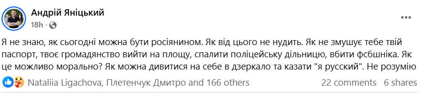 Очільник департаменту комунікацій Державної служби зайнятості Андрій Яніцький питається, як після таких подій можна бути росіянином і ніяк не протидіяти тому, що робить їхня влада та армія? Як можна дивитися на себе в дзеркало та казати «я русский»?