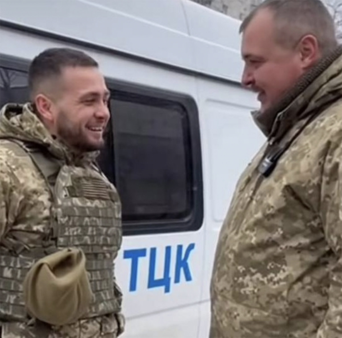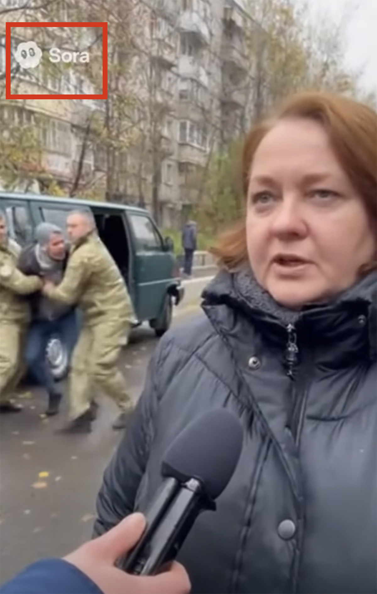 Фрагмент фейкового відео з фейсбуку, яке було згенероване штучним інтелектом. Жінка говорить, що ніякої примусової мобілізації в Україні немає, тоді як позаду неї військові тягнуть чоловіка до «бусика»