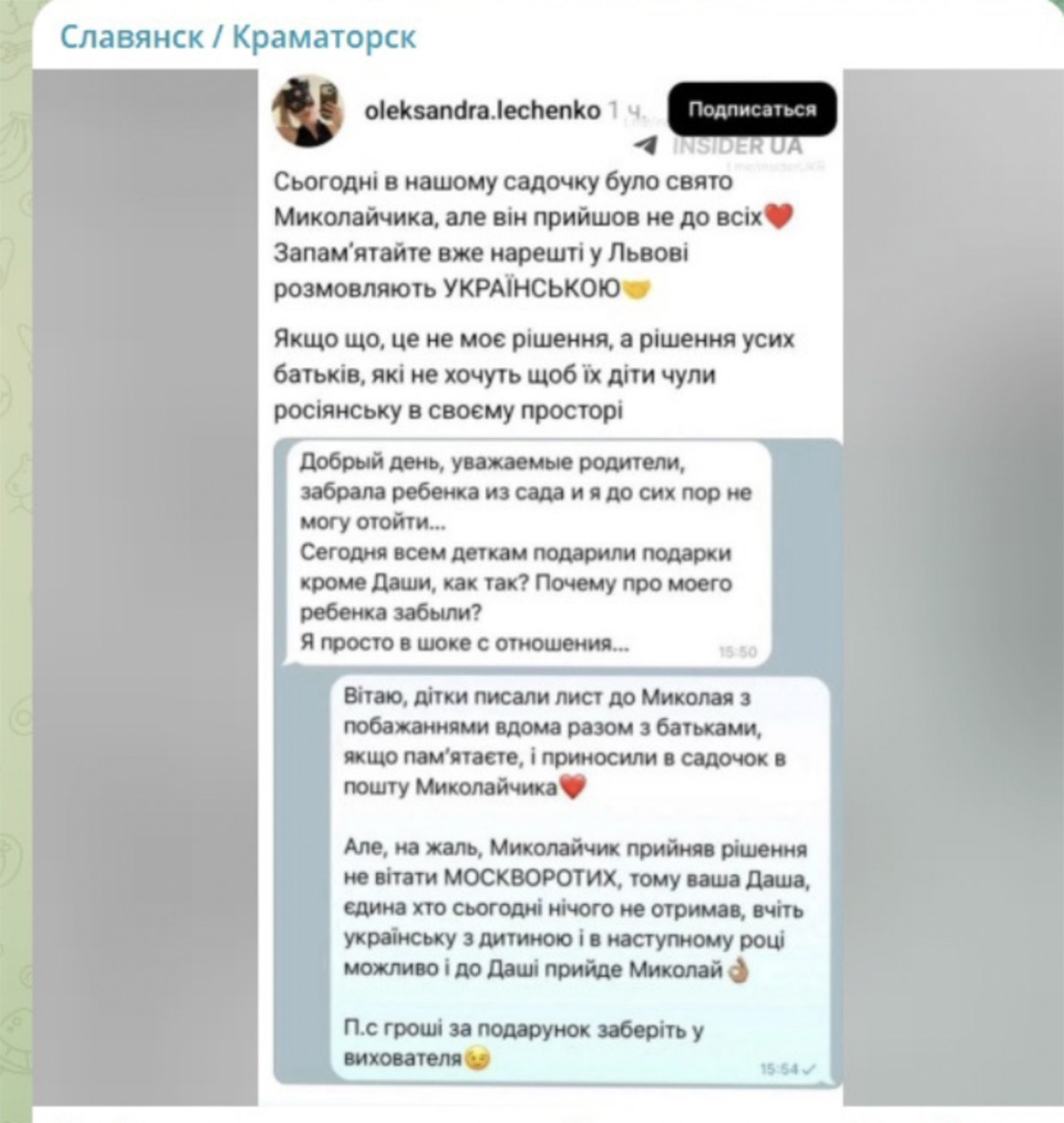 Скриншот фейкового допису про «дитину ВПО зі Львова», якій нібито не дали подарунок до Дня святого Миколая через російську мову спілкування. Поширений у місцевій групі. Маніпуляція побудована на емоційних тригерах і спрямована на штучне протиставлення «своїх» і «чужих»
