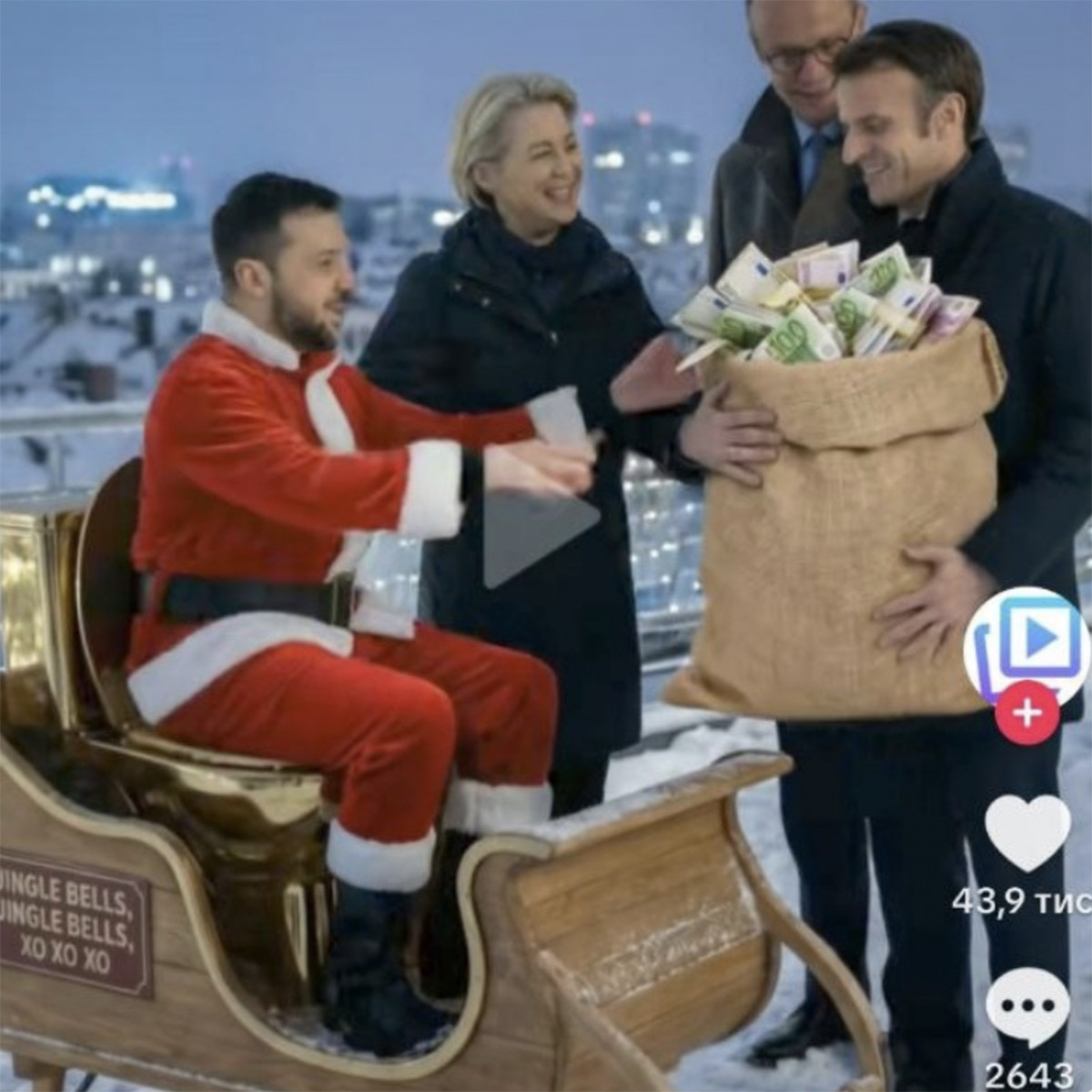 AI-згенероване відео, у якому Володимира Зеленського зображують у ролі Санта-Клауса: європейські лідери передають йому мішок грошей, після чого він забирає кошти й у відповідь роздає символічні «подарунки». Маніпуляція спрямована на дискредитацію міжнародної фінансової підтримки України та формування уявлення про зловживання допомогою