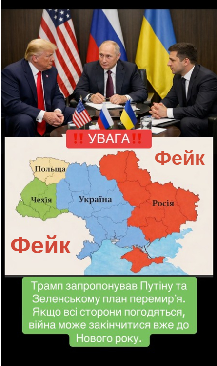 Також у тіктоці поширюють фото з неправдивою інформацією. Наприклад, на одній зі сторінок у тіктоці йдеться, що нібито президент США Дональд Трамп запропонував Путіну та Зеленському план перемир'я. До їх згенерованого ші фото є підпис, мовляв, якщо сторони погодяться, то війна може закінчитися до Нового року.