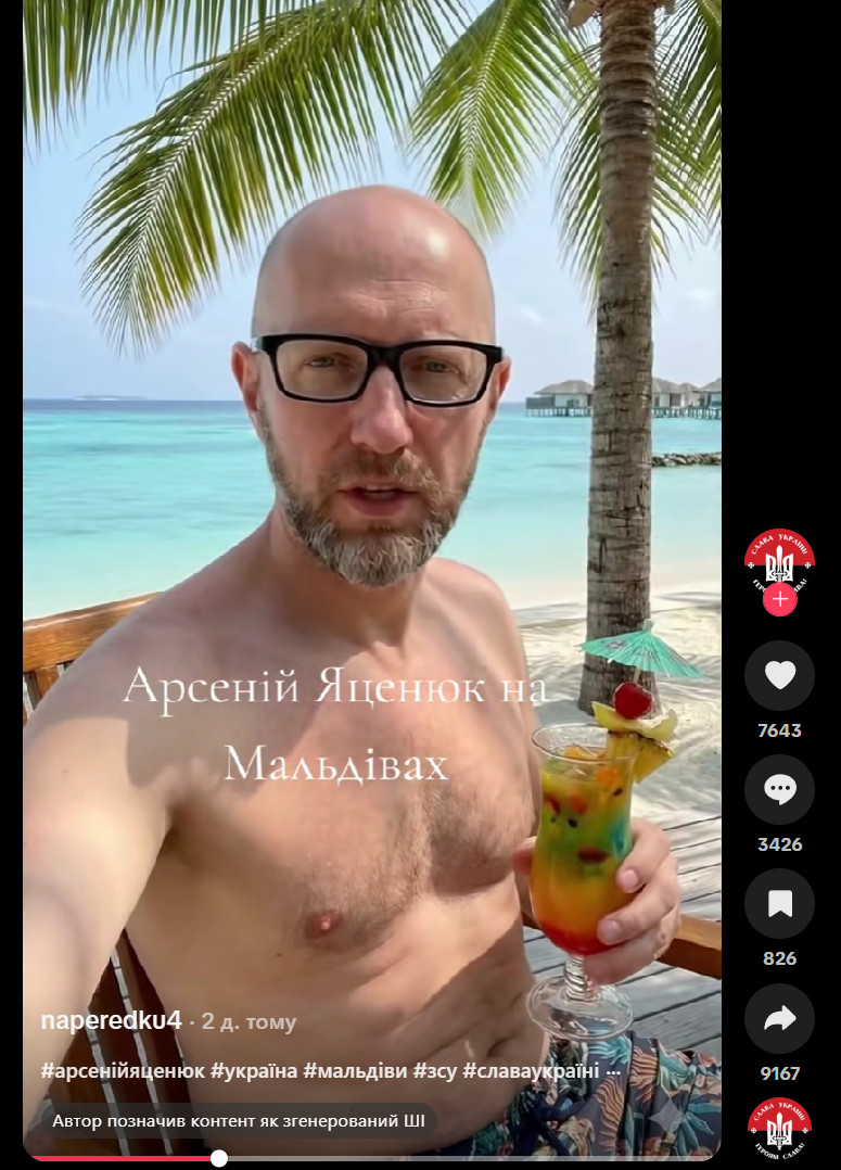 У тіктоці масово поширюють ШІ-діпфейки. Наприклад, згенероване відео з політиком, колишнім прем'єр міністром України Арсенієм Яценюком, який нібито зараз перебуває на Мальдівах. Це відео можна навіть не перевіряти у спеціальних програмах на несправжність, бо автор позначив контент, як згенерований ШІ. На відео зобразили політика на пляжі.