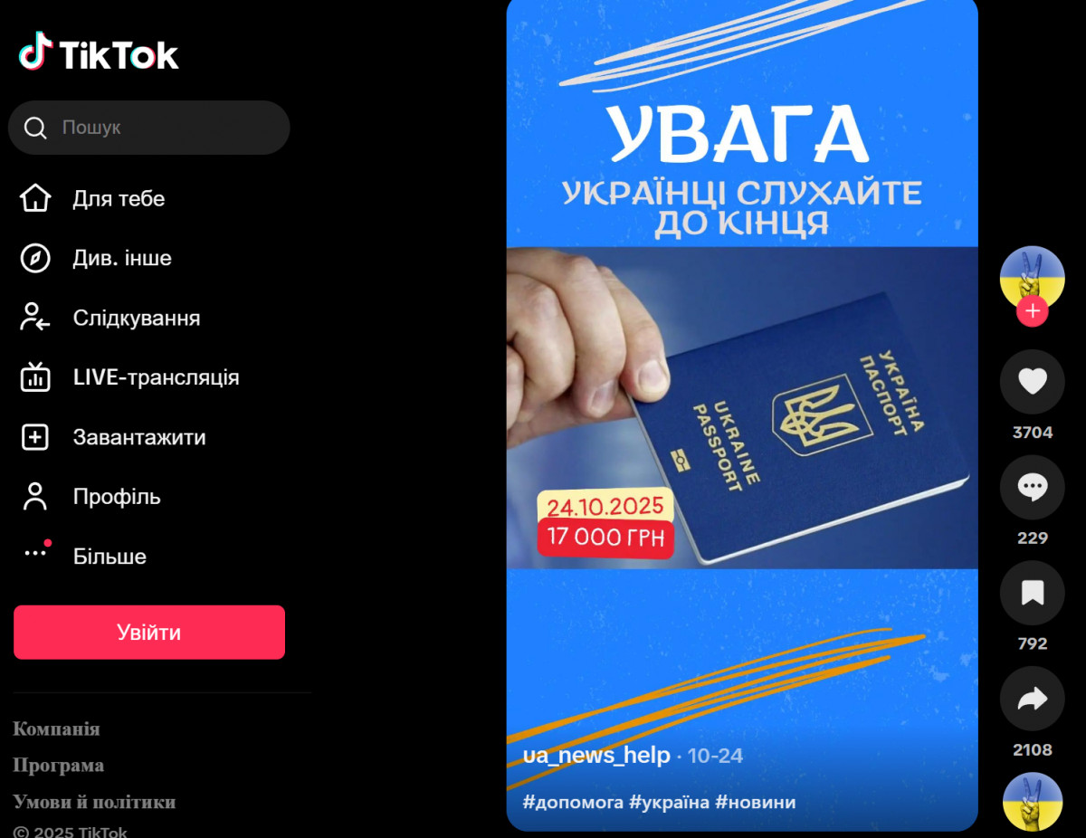 У тіктоці також поширені фейки про допомогу від держави чи Європарламенту, якої насправді не існує.