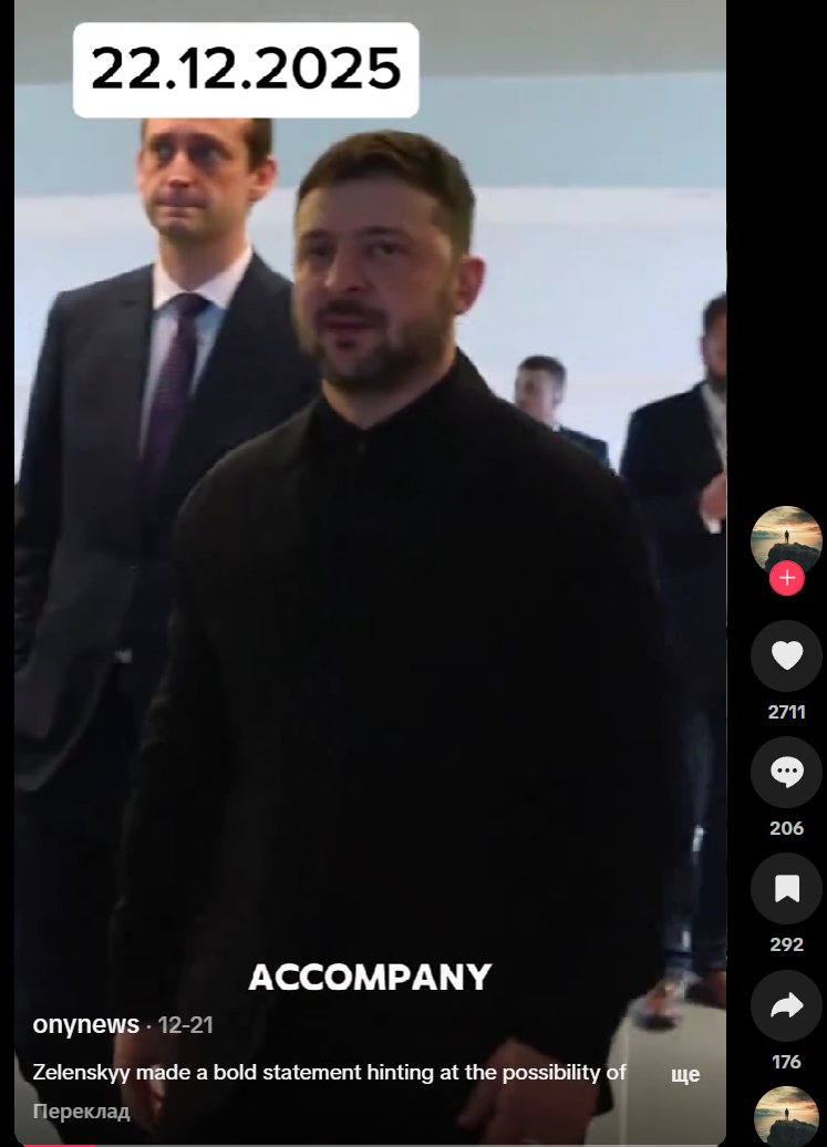 У одному з таких відео у тіктоці голос за кадром говорить, що Зеленський зробив гучну заяву, натякаючи на початок третьої світової війни. У відео президент начебто каже, що якщо Україна буде вимушена вийти з Донбасу, або якщо на неї буде тиск з ціллю змусити до цього після переговорів між президентами Росії та США, то це може спровокувати глобальний конфлікт.