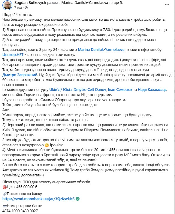 Журналіст та військовослужбовець Богдан Буткевич написав, що надто пізно приєднався до війська, згадав, як проспав початок повномасштабної війни та поширив збір на пікап групі ППО для захисту енергетичних обʼєктів.