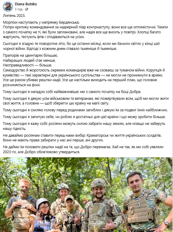 Журналістка та воєнна кореспондентка hromadske Діана Буцко пригадала не перший день повномасштабного вторгнення, а липень 2023 року, коли був наступ у напрямку Бердянська: «Сьогодні я згадую те поворотне літо, бо це останні місяці, коли ми бачили світло у кінці цієї чорної війни. Відтоді з кожним днем ставало тьмяніше й тьмяніше».