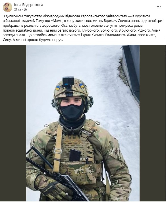 Редакторка «Дзеркала тижня» Інна Ведернікова написала про свого сина, який долучився до лав ЗСУ: «Спецназівець з дитячої гри пробрався в реальність дорослого. Ось, мабуть, моє головне відчуття чотирьох років повномасштабної війни. Під ним багато всього. Глибокого. Болючого. Віруючого. Рідного».