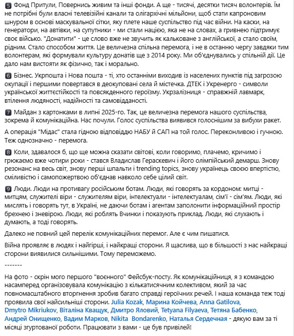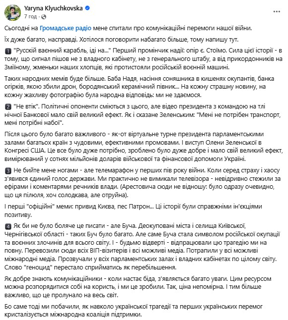 Медіатренерка та фахівчиня з комунікацій Ярина Ключковська перерахувала комунікаційні перемоги у війні. Зокрема, вона згадала гасло «Русскій ваєнний карабль, іді на...», майдан з картонками, висвітлення подій у Бучі і навіть телемарафон.