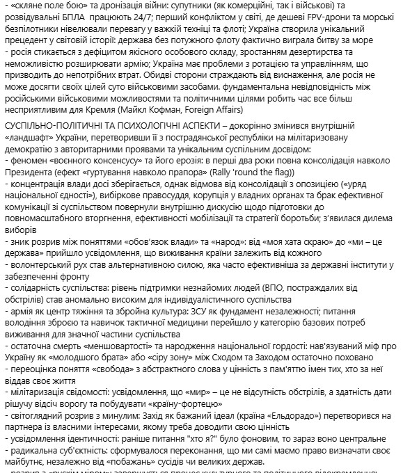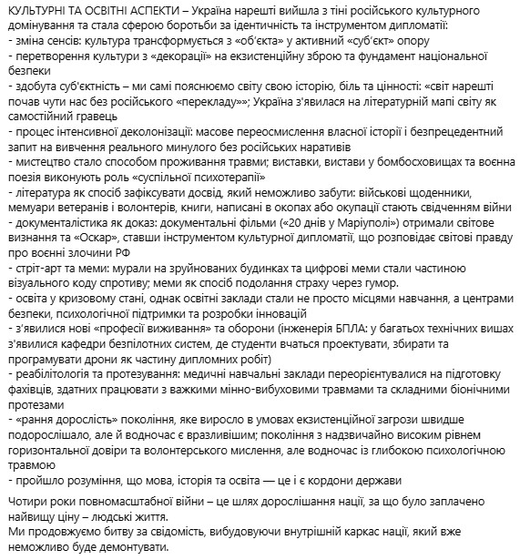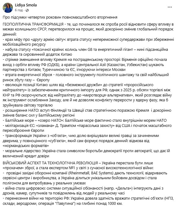 Докторка політичних наук та професорка Київського політехнічного інституту імені Ігоря Сікорського Лідія Смола описала в своєму дописі геополітичні, військові, суспільні та культурні зміни, викликані повномасштабною війною. Попри втрати і виснаження, вона описує чотири роки повномасштабної війни як шлях дорослішання нації.