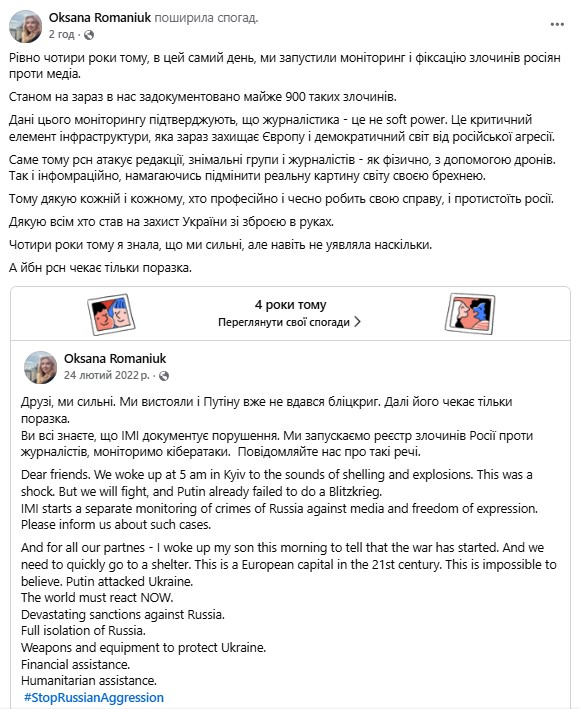 Голова Інституту масової інформації Оксана Романюк повідомила, що за чотири роки з початку повномасштабного вторгнення Росія скоїла 896 злочинів проти журналістів та медіа в Україні, 125 медійників - загинули.