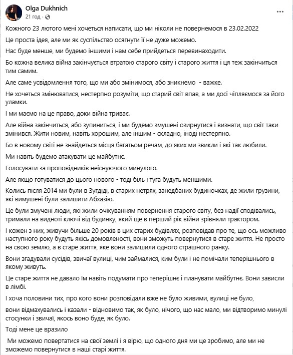 Редакторка й журналістка NV Ольга Духніч написала про переосмислення «старого світу» і прийняття нового життя після війни: «Ми будемо змушені озирнутися і визнати, що світ таки змінився. Жити новим, навіть хорошим, але іншим - складно, іноді нестерпно. Бо в новому світі не знайдеться місця багатьом речам, до яких ми звикли і які так любили. Ми навіть будемо атакувати це майбутнє. Голосувати за проповідників неіснуючого минулого. Але якщо готуватися до цього нового - тоді біль і туга будуть меншими».