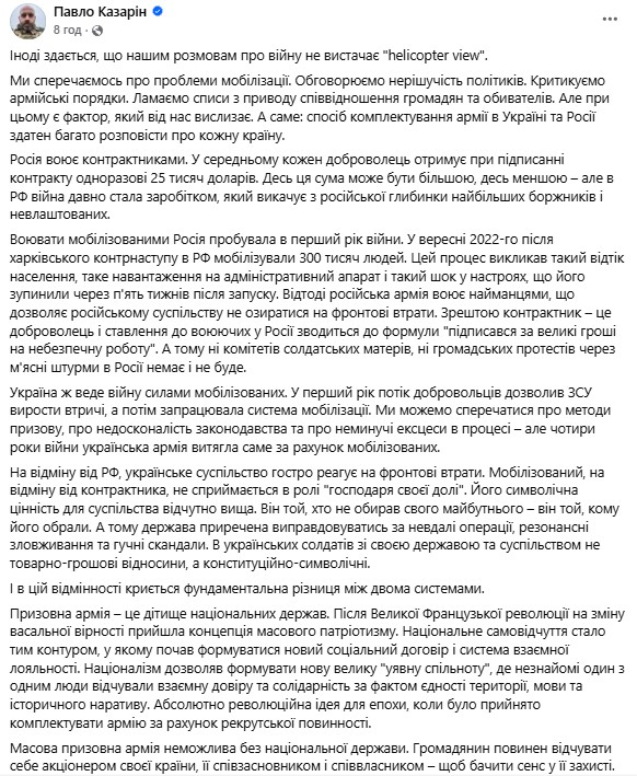 «Фактично Україна останні чотири роки здає тест на спроможність. Вона веде найбільшу війну на континенті за останні 80 років і робить це руками своїх мобілізованих громадян. Так, є ті, хто ховається від призову, ті, хто перепливає Тису і ті, хто йде в СЗЧ. Але якби розмови про "штучність української держави" були правдою, то війну Україна програла б ще 2022-го. Тримати фронт армією мобілізованих – це найкращий тест на життєздатність країни. Україна його пройшла – чого не скажеш щодо Росії», - пише Казарін.