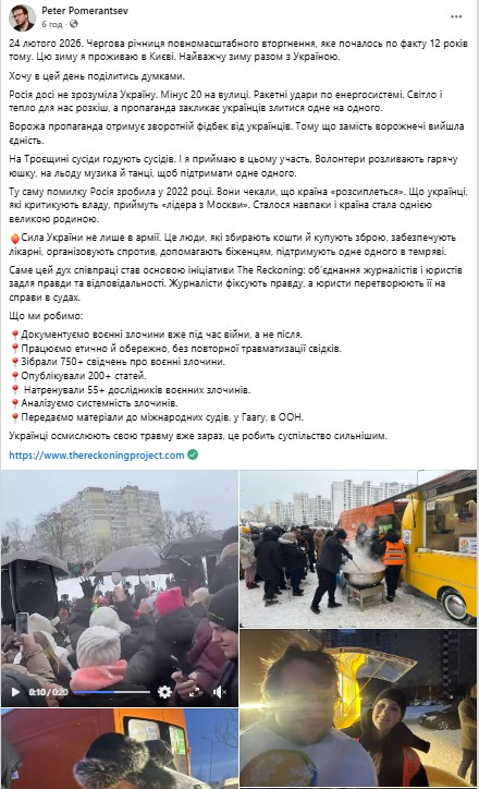 Британський письменник та дослідник пропаганди Пітер Померанцев, який зараз знаходиться в Києві, ділиться враженнями від четвертої річниці великого вторгнення, отриманими серед киян на Троєщині: «Сусіди годують сусідів. І я приймаю в цьому участь. Волонтери розливають гарячу юшку, на льоду музика й танці, щоб підтримати одне одного. Ту саму помилку Росія зробила у 2022 році. Вони чекали, що країна «розсиплеться». Що українці, які критикують владу, приймуть «лідера з Москви». Сталося навпаки і країна стала однією великою родиною».