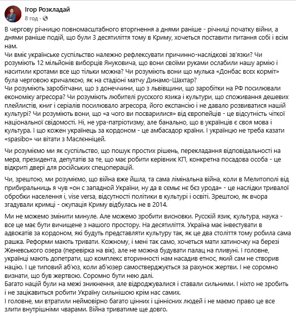 Медіаюрист, заступник директора Центру демократії та верховенства права Ігор Розкладай питається, чи вміє українське суспільство належно рефлексувати причинно-наслідкові звʼязки? Він підкреслює, що змінити минуле не можливо, але українці мають зробити правильні висновки, вичистити український інфопростір від російського впливу і не зіпсувати все внутрішніми чварами.