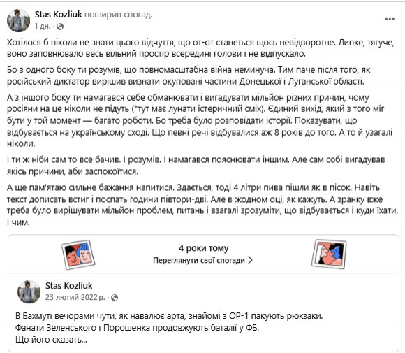 Журналіст і фотокореспондент Стас Козлюк описав свої відчуття напередодні вторгнення: коли було розуміння, що велика війна неминуча, але підсвідомість шукала причини у це не вірити.