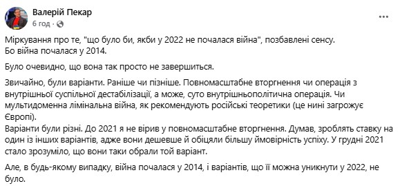 Також він зауважив, що війна почалася у 2014, і варіантів, що її можна уникнути у 2022, не було.