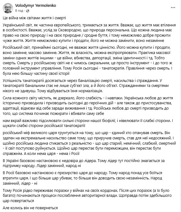 «Це війна між світами життя і смерті», - написав філософ Володимир Єрмоленко. Він пише, що українська любов до життя історично призводила до героїчних дій, а російська любов до смерті призводить до того, що система починає пожирати і вбивати саму себе.