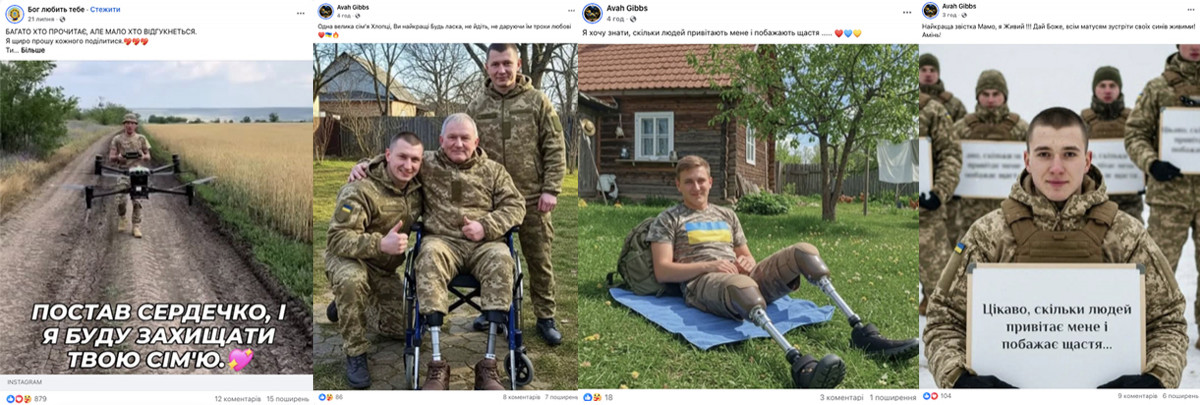 Зображення українських військових із «протезами», на «передовій», на фоні пейзажів абощо, з написами на кшталт «Він заслуговує хоч на одне “спасибі”», «Подаруйте їм любов», «Постав сердечко, і я буду тебе захищати», «Цікаво, скільки людей привітають мене і побажають мені щастя» тощо.