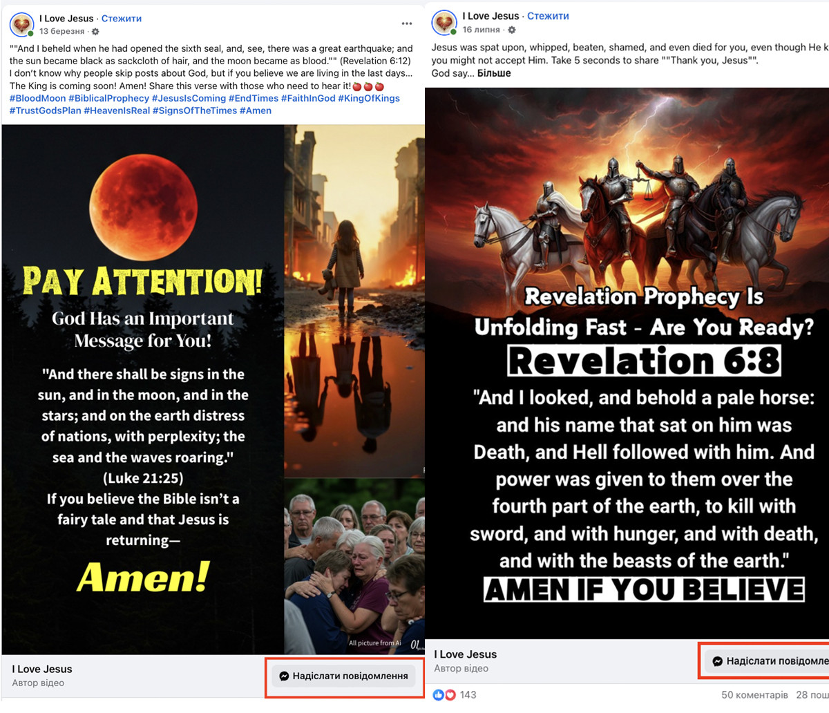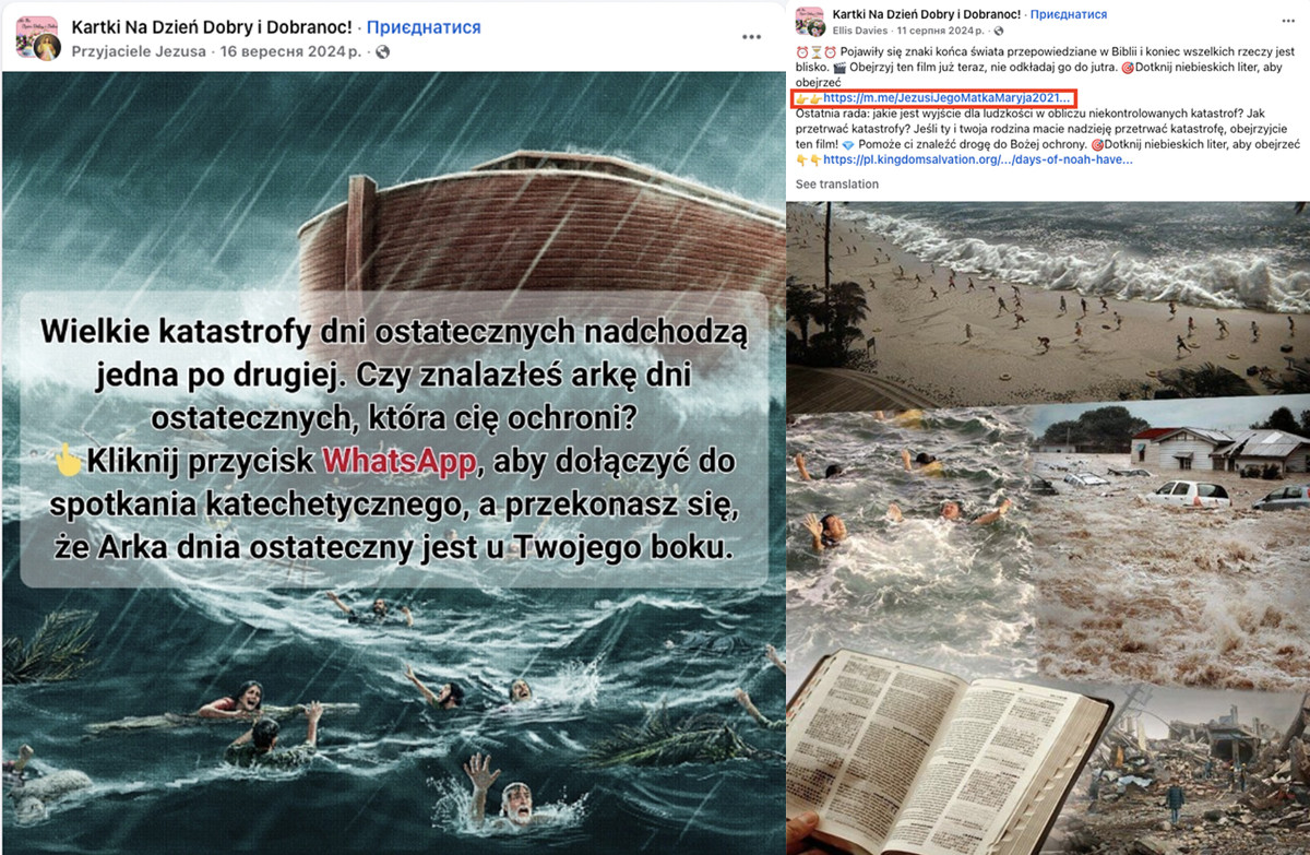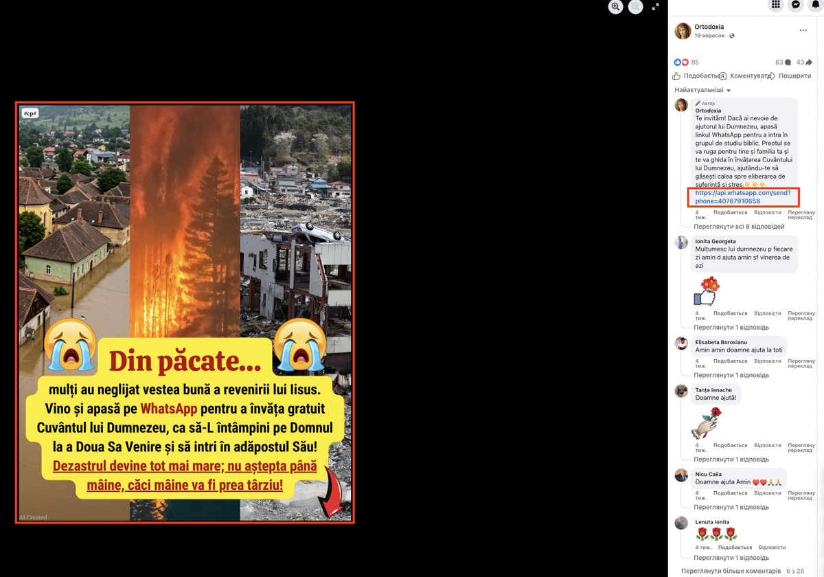 Крок 2. Апокаліптичні лякалки з посиланнями у закриті групи в месенджерах. Коли клікбейтний допис уже набрав охоплення, його можуть відредагувати — або ж поруч починають з’являтися нові апокаліптичні дописи: «кінець світу близько», «щоб вижити, дізнайся правду». Далі людину підштовхують перейти в WhatsApp чи Facebook Messenger — нібито заради молитви, пояснення або «особливого семінару».