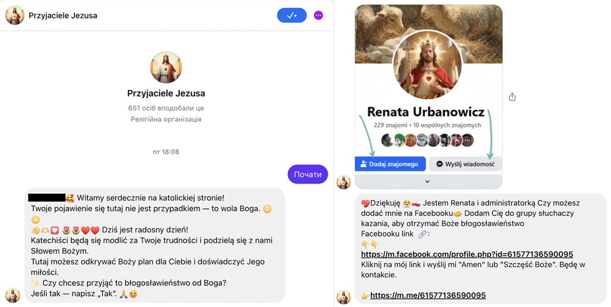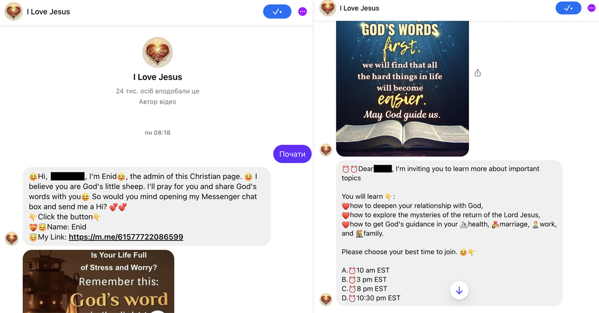 - Переведення у месенджери. У дописах — запрошення в закриті WhatsApp/Facebook Messenger-групи нібито для «молитов», «благословень» чи «особливих подій».