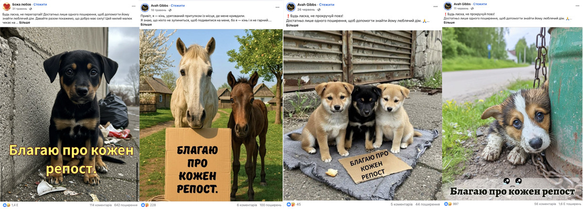 Зображення тварин (здебільшого собак), які «шукають дім», із благаннями про репост або з підписом «молімося за тварин, які теж страждають».