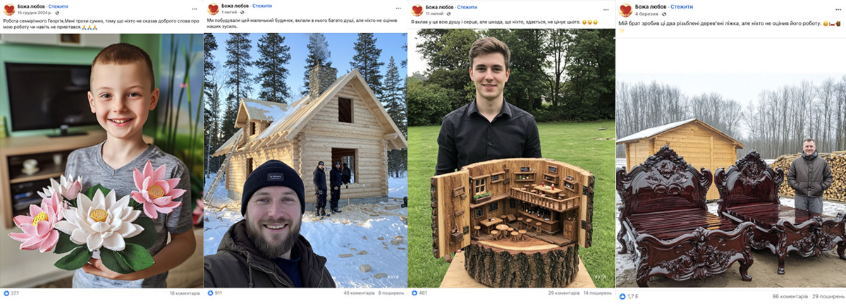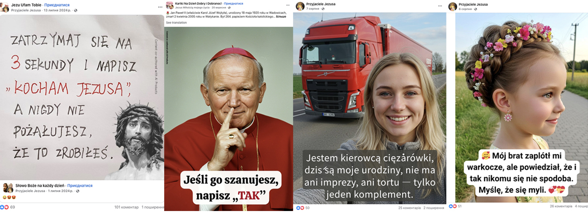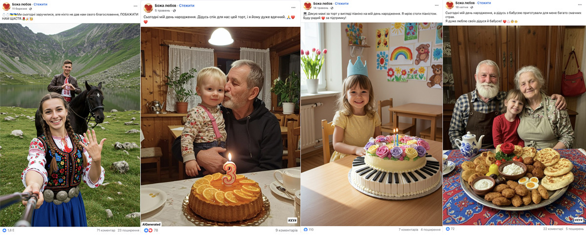 Крок 1. Емоційний клікбейт. «ЦВБ» публікує ШІ-генерований контент на патріотичну, побутову або релігійну тематику, щоб зібрати лайки, коментарі й репости. Мета тут проста: розігнати охоплення і підготувати ґрунт для наступного етапу маніпуляцій. Найпоширеніші формати включають: