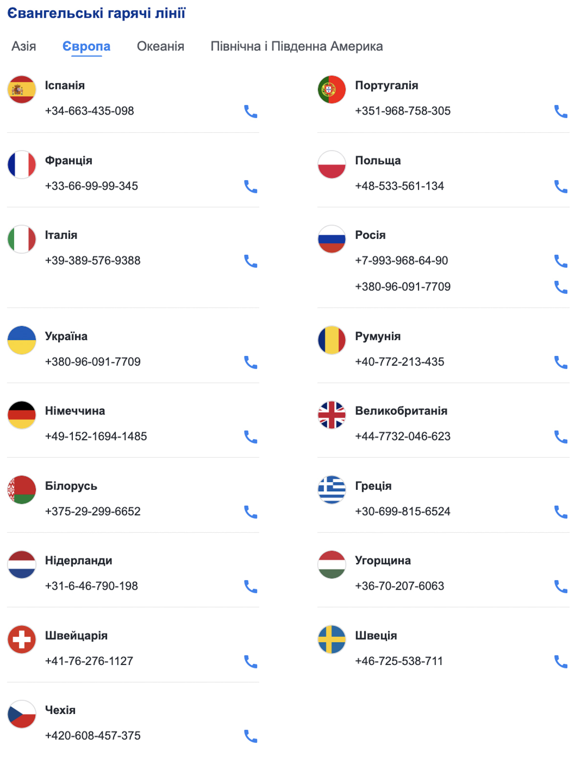 На середину березня 2026, ЦВБ відкрила «євангельські гарячі лінії» у 42 країнах світу, з них 17 — у Європі.