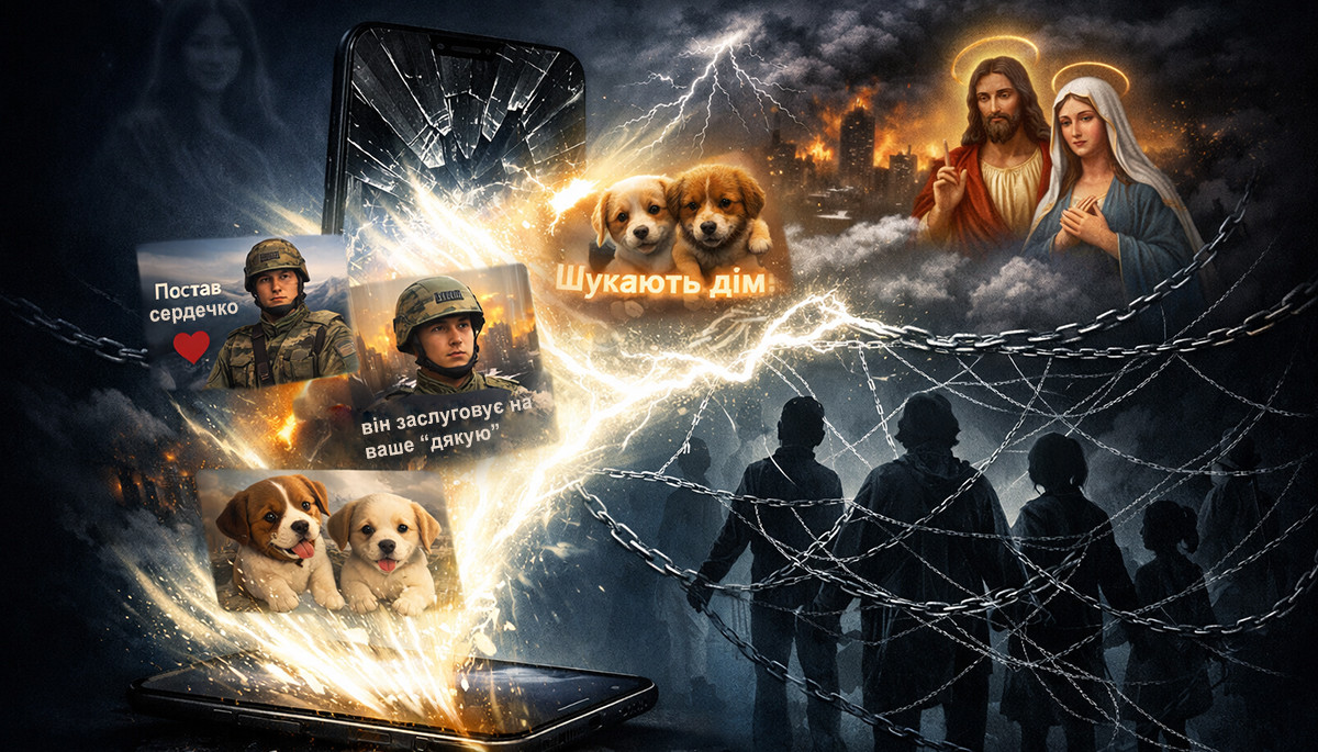 Представники «ЦВБ» не приходять до вашого дому в чорному плащі, з брошурою в руках і з дзвінком у двері. Вони заходять через стрічку різних соцмереж, особливо фейсбуку — у вигляді зворушливих картинок, ШІ-відео з іконами, дописів про військових, яких «ніхто не привітав», і цуценят, які «шукають дім». Усе це працює як емоційна приманка: люди лайкають і поширюють ці дописи, сторінки «ЦВБ» набирають охоплення, алгоритми соцмереж підсувають їх новим людям, а далі аудиторію затягують у закриті чати.