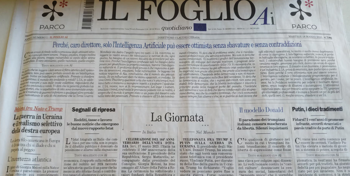 Італійська газета Il Foglio випустила газету, яку повністю створив штучний інтелект. За словами головред Клаудіо Чераза, такі газети випускатимуть щодня протягом місяця, щоб показати, як ШІ впливає на роботу журналістів і повсякденне життя. Про це повідомило The Guardian.