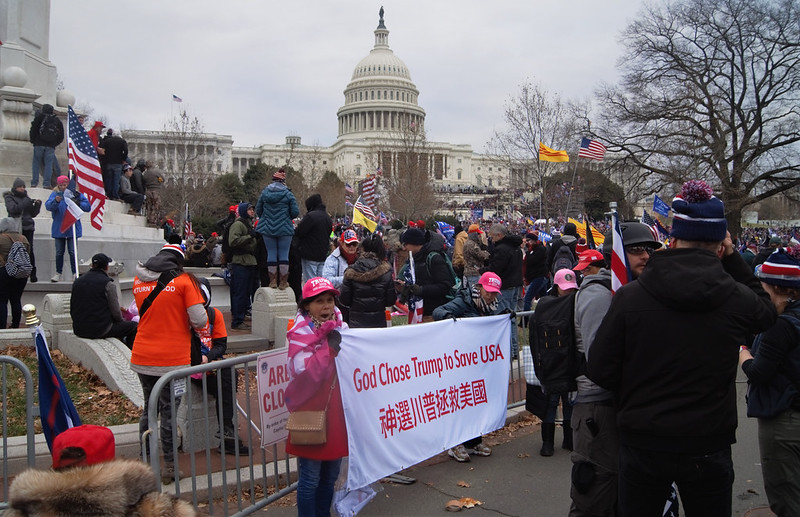 Перед захопленням Капітолію, 6 січня 2021 року. На плакаті написано: «Бог обрав Трампа врятувати США». Джерело: flickr.com/Tyler Merbler