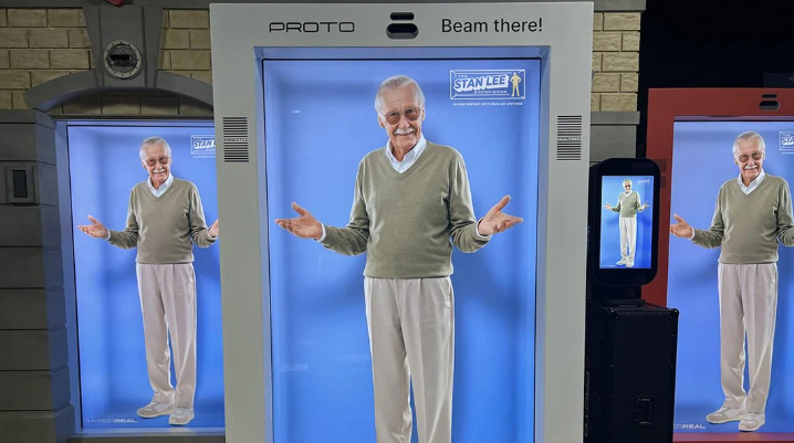 На голограмі Лі, який помер у 2018 році у віці 95 років, одягнений у зелений светр та коричневі штани та стоїть тлі яскраво-синього екрану. Вболівальники можуть поспілкуватися з аватаром у закритій кабінці в конференц-центрі Лос-Анджелеса.