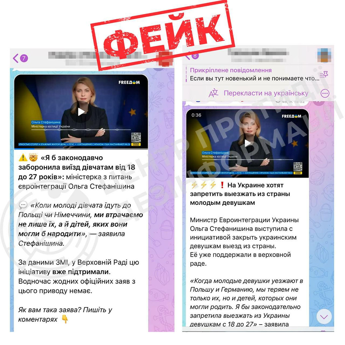 Дипфейк «заяви Ольги Стефанішиної». У червні 2025-го з’явилося підробне відеозвернення, де буцімто віцепрем’єрка Ольга Стефанішина оголошує про заборону виїзду за кордон для українських жінок 18—27 років. Фейковий ролик був стилізований під етер українського телеканалу Freedom. Насправді уривок новинної студії взяли з телемарафону «Єдині новини», а аудіодоріжку повністю згенерували за допомогою ШІ. На це вказувала неприродна інтонація та спотворена вимова — голос «Стефанішиної» звучав, як синтезований комп’ютером. Крім того, справжні ведучі телеканалу Freedom — інші люди, й мовлення там ведеться російською, а не українською. Тож такий ляп швидко викрив себе. Метою ж цього дипфейку було посіяти паніку серед жінок і підірвати довіру до держави.