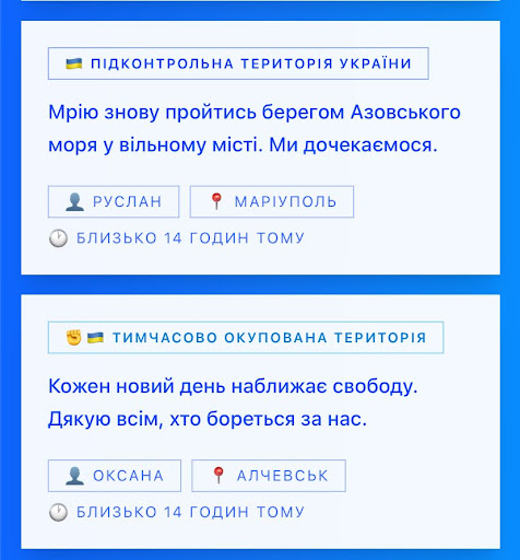 На сайті є публічна стрічка повідомлень з текстами від користувачів. Кожне повідомлення супроводжується позначкою «Підконтрольна територія» чи «Тимчасово окупована територія». Вказується приблизний час публікації та якщо зазначено - імʼя та місто, звідки відправлено.