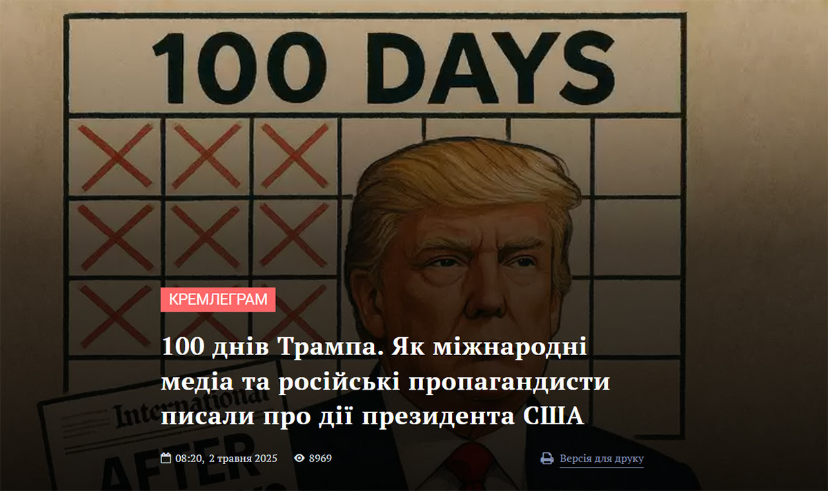 Коли минуло 100 днів, як Дональд Трамп удруге обійняв посаду Президента Сполучених Штатів, українські та закордонні медіа підготували його огляди роботи. Російські пропагандистські медіа — не виняток. Для того, щоб дослідити реакції, Центр досліджень «Детектора медіа» проаналізував статті у The Washington Post, New York Post, Die Welt та інших, а також масив із 311 повідомлень у проросійських пропагандистських телеграм-каналах від початку 28 квітня до 11:00 1 травня 2025 року, що містив комбінацію ключових слів «100 днів», «сто днів» і «Трамп».
