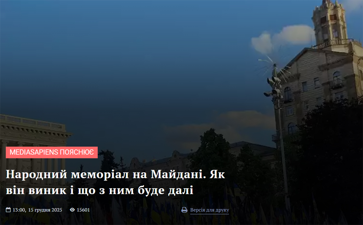 Народний меморіал на Майдані Незалежності став простором, де кожен може встановити прапорець на честь загиблого чи загиблої у російсько-українській війні. Сюди приходять лідери країн та іноземні делегації, однак фактично меморіал утримують лише родичі полеглих. Він також не має належного захисту й не раз ставав мішенню вандалів. Марина Крижня розповіла, як з’явився меморіал, чи можливо впорядкувати його стихійність і надати офіційного статусу. Однак внесення меморіалу у реєстр нерухомих пам’яток може ускладнити додавання нових прапорців, якщо хтось захоче вшанувати там свого загиблого родича. Таким чином народна ініціатива порушує складне, але важливе питання правильності збереження пам’яті та поваги до полеглих.
