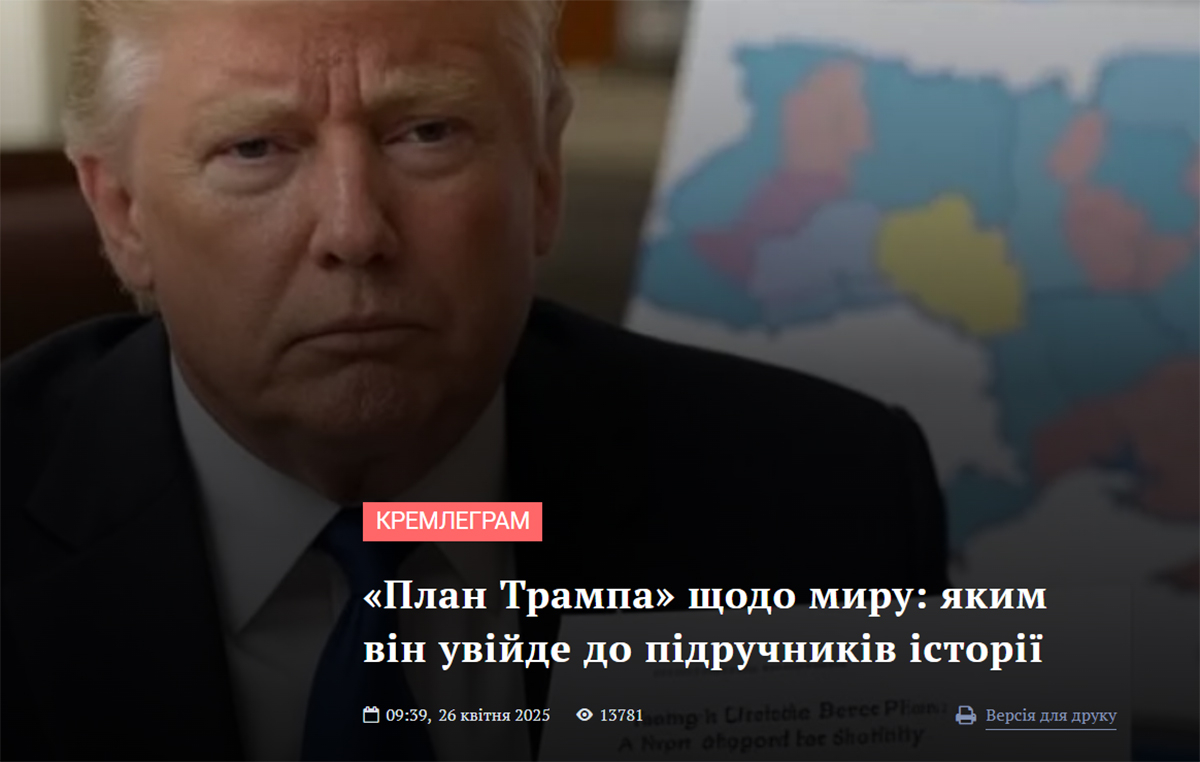 У квітні Reuters опублікував повний текст «плану Трампа», з яким ознайомилася аналітикиня Леся Бідочко. У плані пропонувалося припинення вогню по лінії фронту, юридичне визнання США російського статусу Криму, де-факто визнання інших російських територіальних захоплень в Україні, заборона на членство України в НАТО, передача Запорізької АЕС в управління США тощо. Серед інших вимог ішлося про підписання угоди про корисні копалини між США та Україною, а відповідальність за гарантії безпеки для України повністю переклали на Європу. Окрім цього, Трамп заявляв, що Росія зробила «досить велику поступку» щодо «мирного врегулювання», зокрема начебто «припинення захоплення цілої країни». Однак виявилося, що у 2025 році цей «мирний план» не перший і далеко не останній.