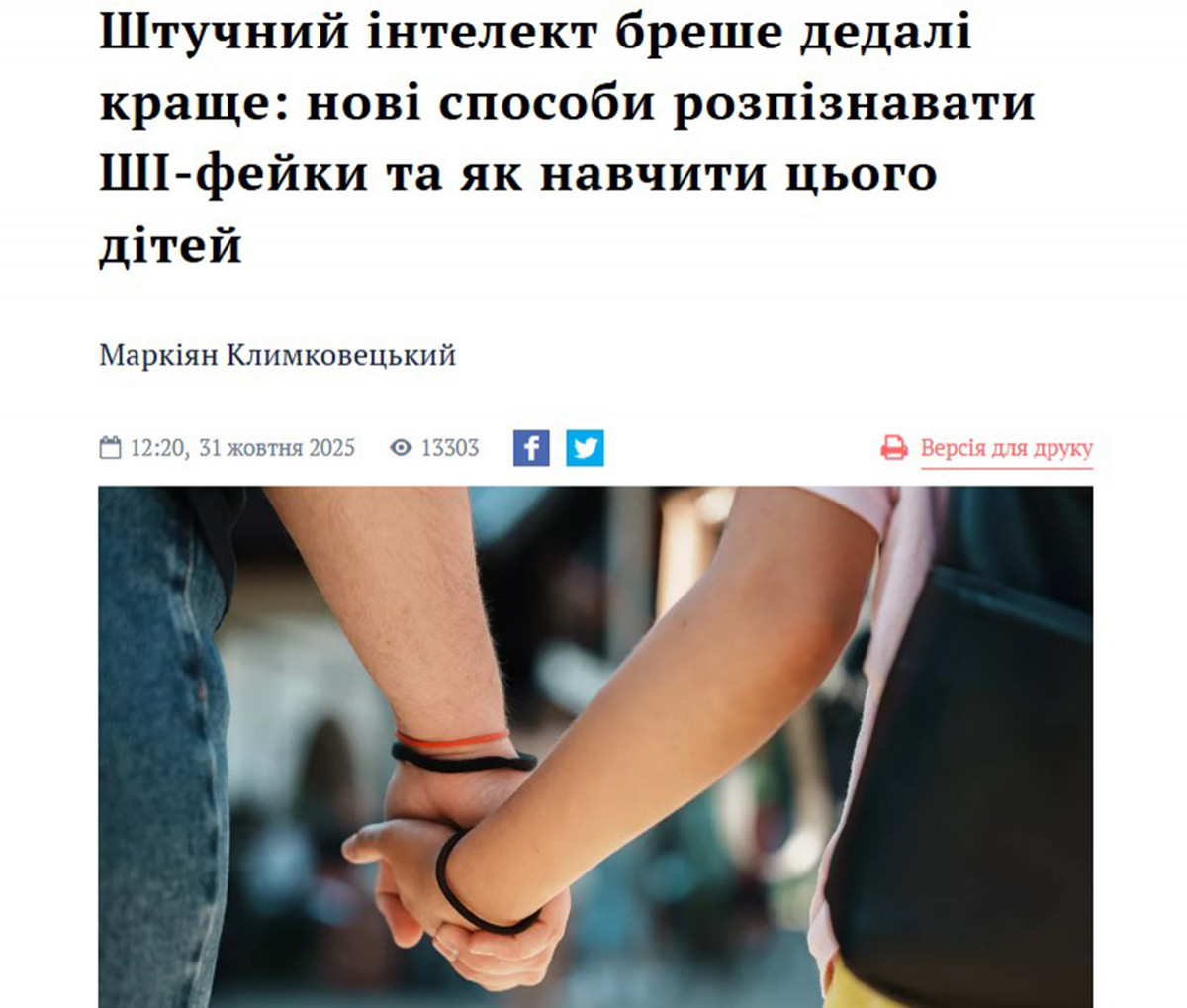 Станом на початок 2026 року технології штучного інтелекту навчилися створювати надреалістичні фото, відео й аудіо. Фейки більше не виглядають кумедно або очевидно — вони можуть бути дуже переконливими. Це становить небезпеку не лише для дорослих — особливо вразливими є діти, які щодня черпають інформацію з інтернету. Автор Маркіян Климковецький поспілкувався з медіаекспертами про те, якими інструментами користуватися, аби відрізняти ШІ-контент, і як залучати дітей до медіаграмотності.