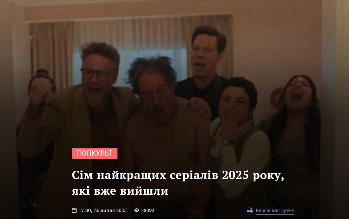 Легкий і водночас змістовний гід найцікавішими серіалами першої половини 2025 року, який допомагає не загубитися в потоці прем’єр. Авторка Гала Скляревська розповідає, чим саме кожен проєкт заслуговує на увагу: від технічних експериментів і сильних акторських робіт до роздумів про кібербулінг та інші складні соціальні теми. У перелік увійшли такі новинки 2025 року як «Юнацтво», «Студія», «Померти заради сексу», «Відділ Q» та інші.